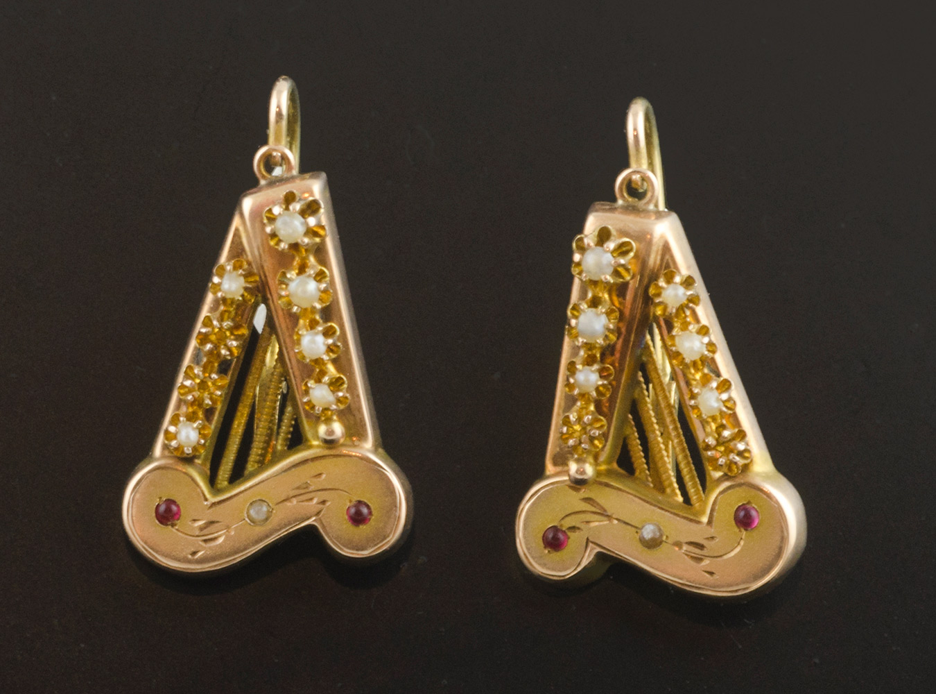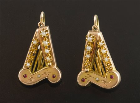 Orecchini in oro giallo a monachella a forma di arpa con microperle, metà '800