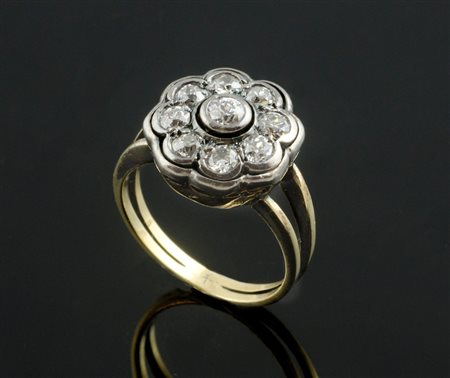 Antico anello in oro e argento a forma di fiore con diamanti per ca ct tot. 0,60