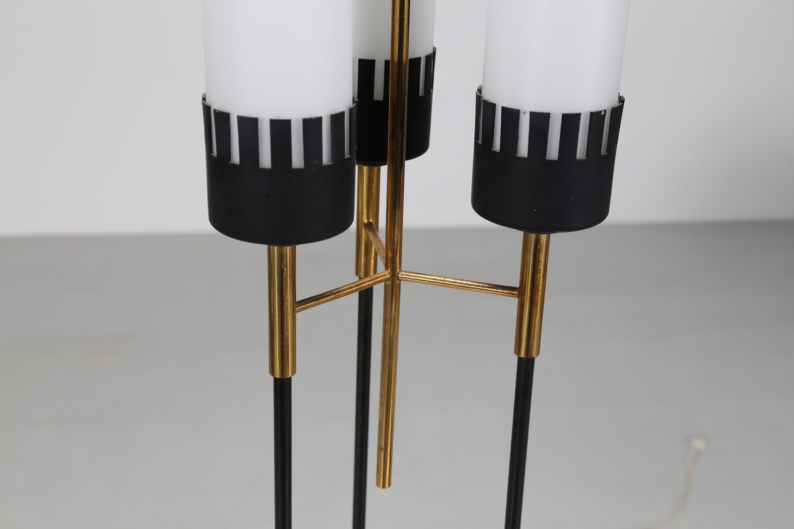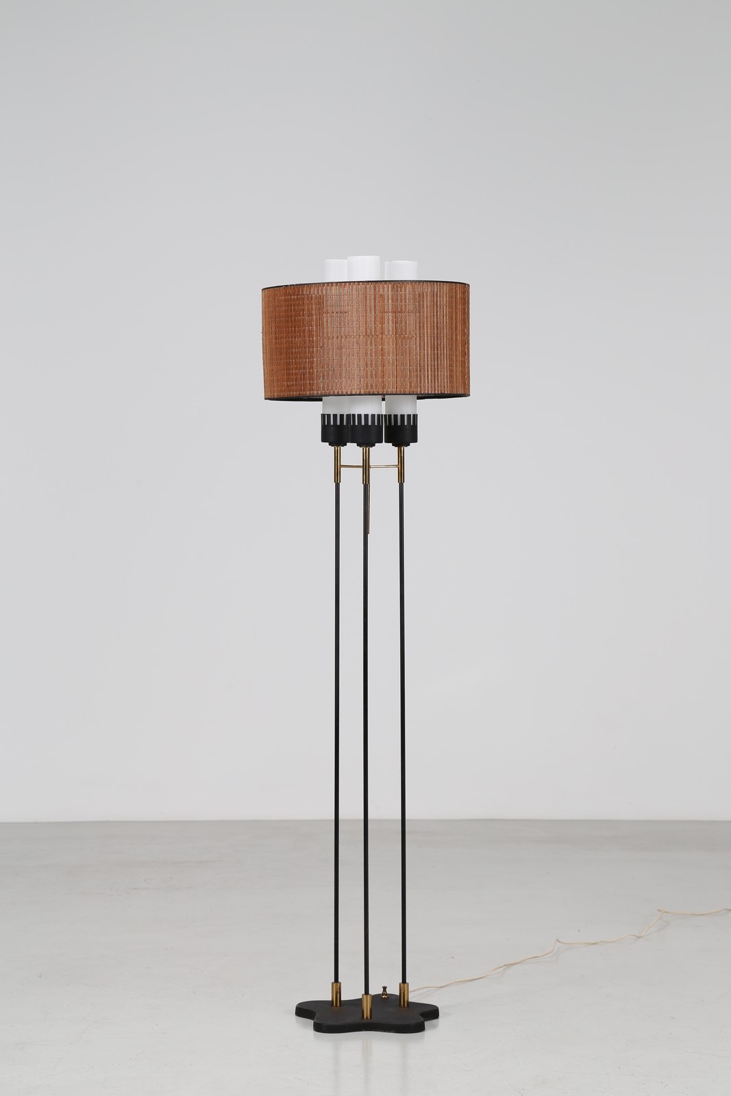 STILUX - MILANO Lampada da terra in ottone, metallo laccato, ghisa goffrata, vetro opalino e paralume in paglia, anni 50. -. Cm 46,00 x 167,00 x 46,00.