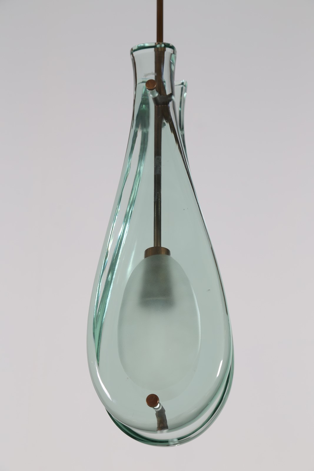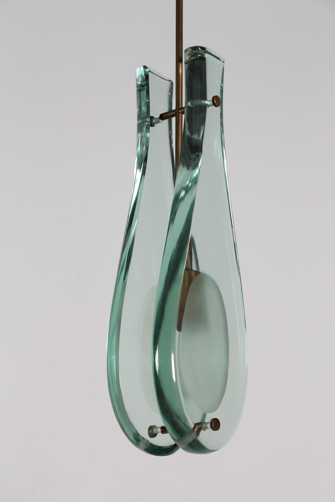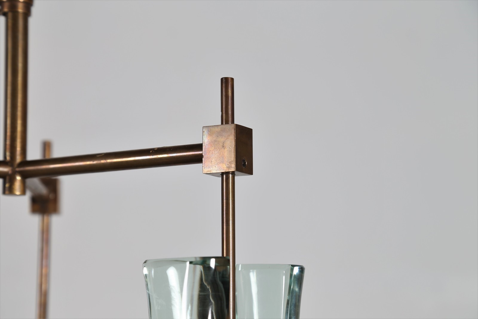 INGRAND MAX (1908 - 1969) Lampada a sospensione in ottone ossidato e cristalli sagomati alla mola con scavi opachi, mod. 2450, per Fontana Arte anni 60 . -. Cm 35,00 x 105,00 x 35,00.