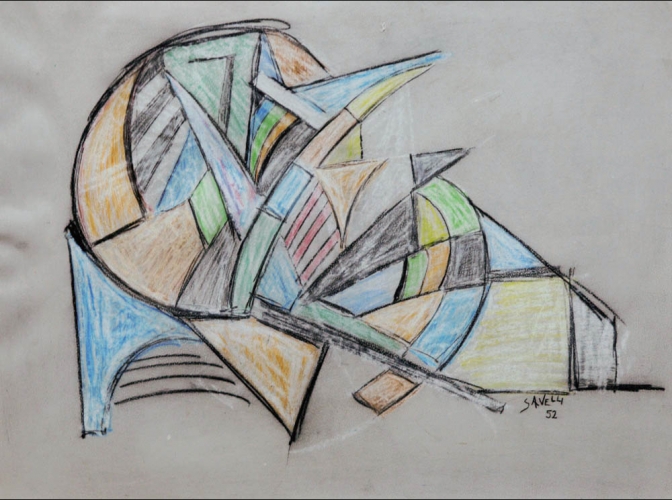 ANGELO SAVELLI 1911 - 1995 " Composizione ", 1952 Pastelli su carta, cm. 50 x 66 Firmato e datato in basso a destra Etichetta Galleria Medarte sul retro Prov. Collezione Privata