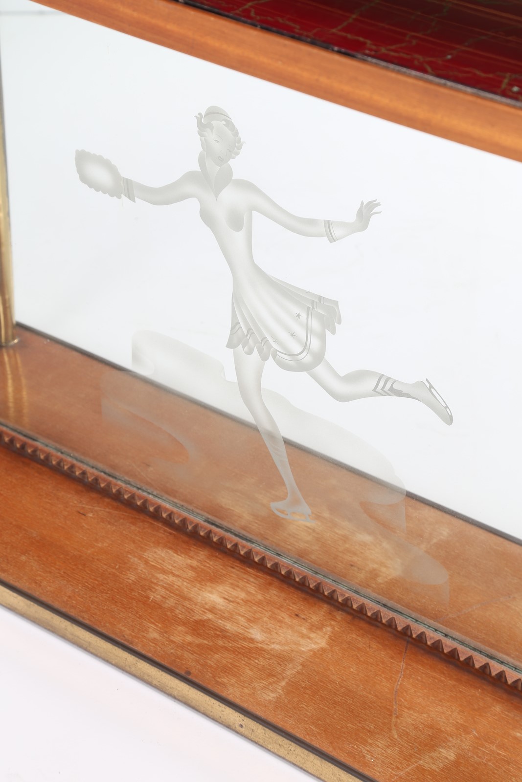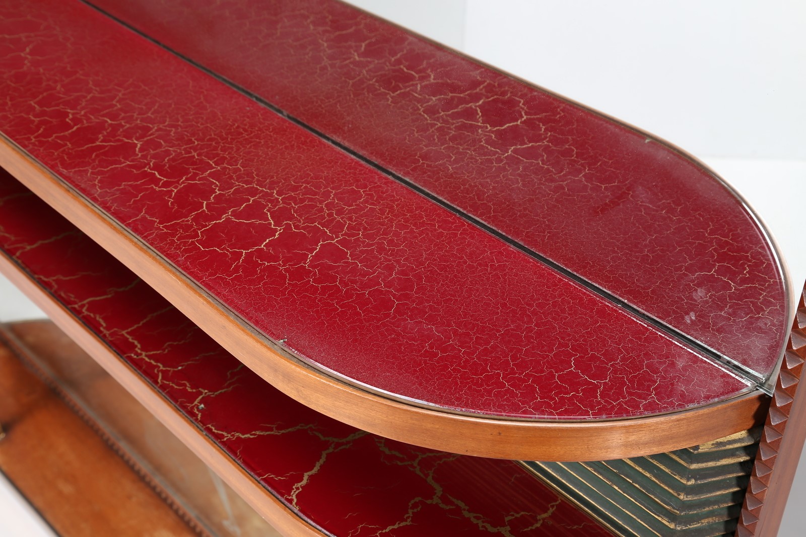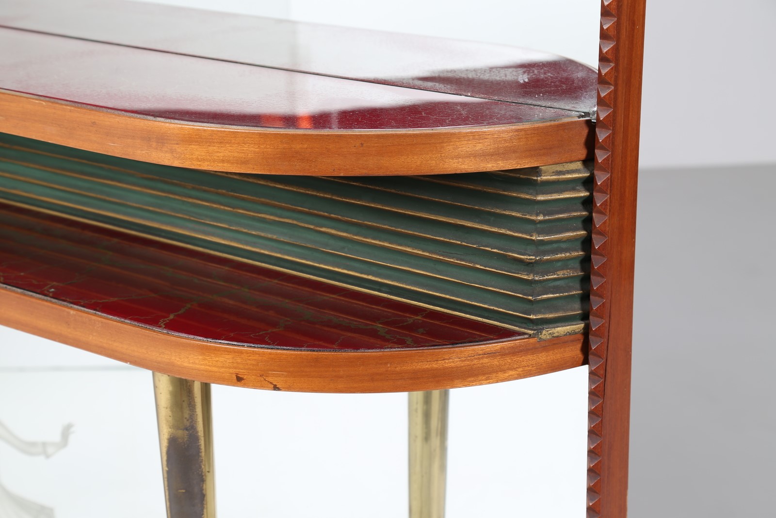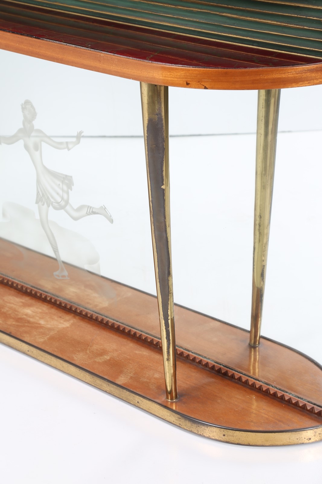 MANIFATTURA ITALIANA Grande consolle con specchiera, in legno con dettagli in ottone e vetro inciso, anni 40. -. Cm 170,00 x 191,00 x 28,00.