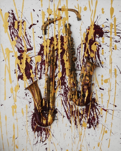 FERNANDEZ ARMAN 1928 - 2005 Senza titolo, 2001 Saxofono tagliato montato su tela riportata su tavola con pittura acrilica rosso borgogna, oro cm. 102 x 82 x 14 Archivio Dante Vecchiato n. D 1511 - 0612 Prov. Collezione privata