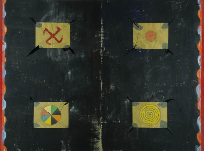 LUCIANO BARTOLINI 1948 - 1994 " Colonna di mezzo ", 1987 Tecnica mista e collage su carta telata, cm. 149 x 200 Firmato e datato sul retro Etichetta Bologna Arte Fiera sul retro Pubblicato Catalogo " Luciano Bartolini, Kosmische Visionen ", Helmut Friedel Pubblicato Catalogo " Le virtù della mano ", 1987, p.57 Ed. Nuovi Strumenti, 1987 Prov. Collezione Privata