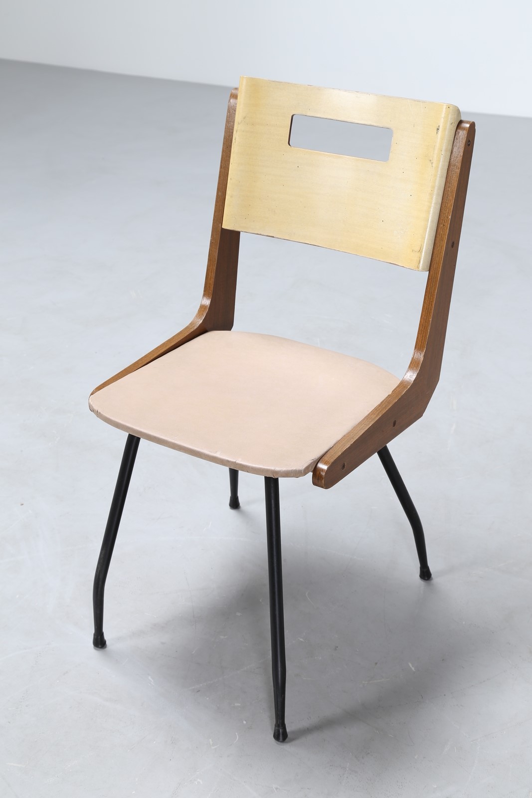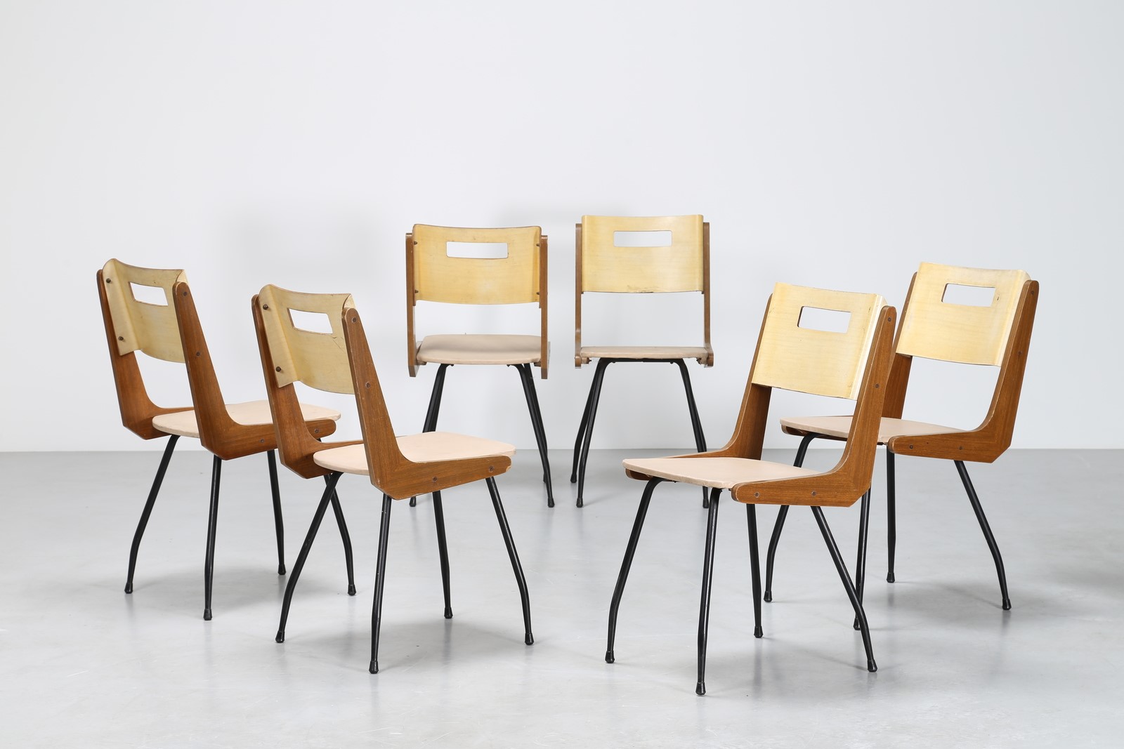 MANIFATTURA ITALIANA Sei sedie in tondino di ferro legno formica e sky, anni 50 . -. Cm 45,00 x 83,00 x 41,00.