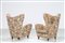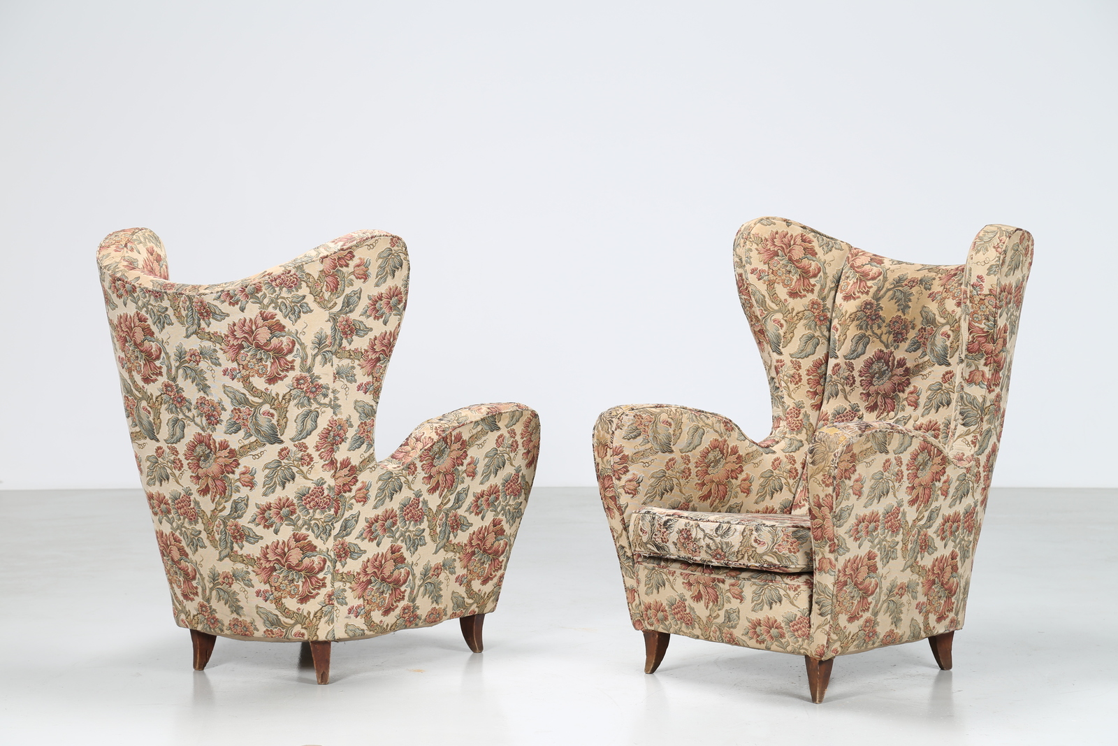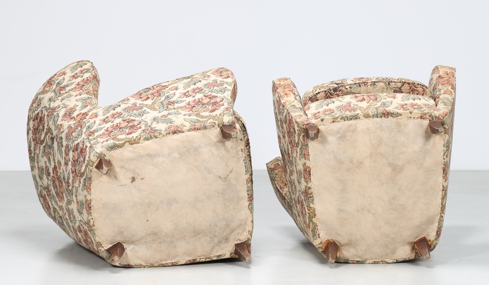 MANIFATTURA ITALIANA Coppia poltrone in tessuto e legno, anni 50. -. Cm 80,00 x 103,00 x 86,00.