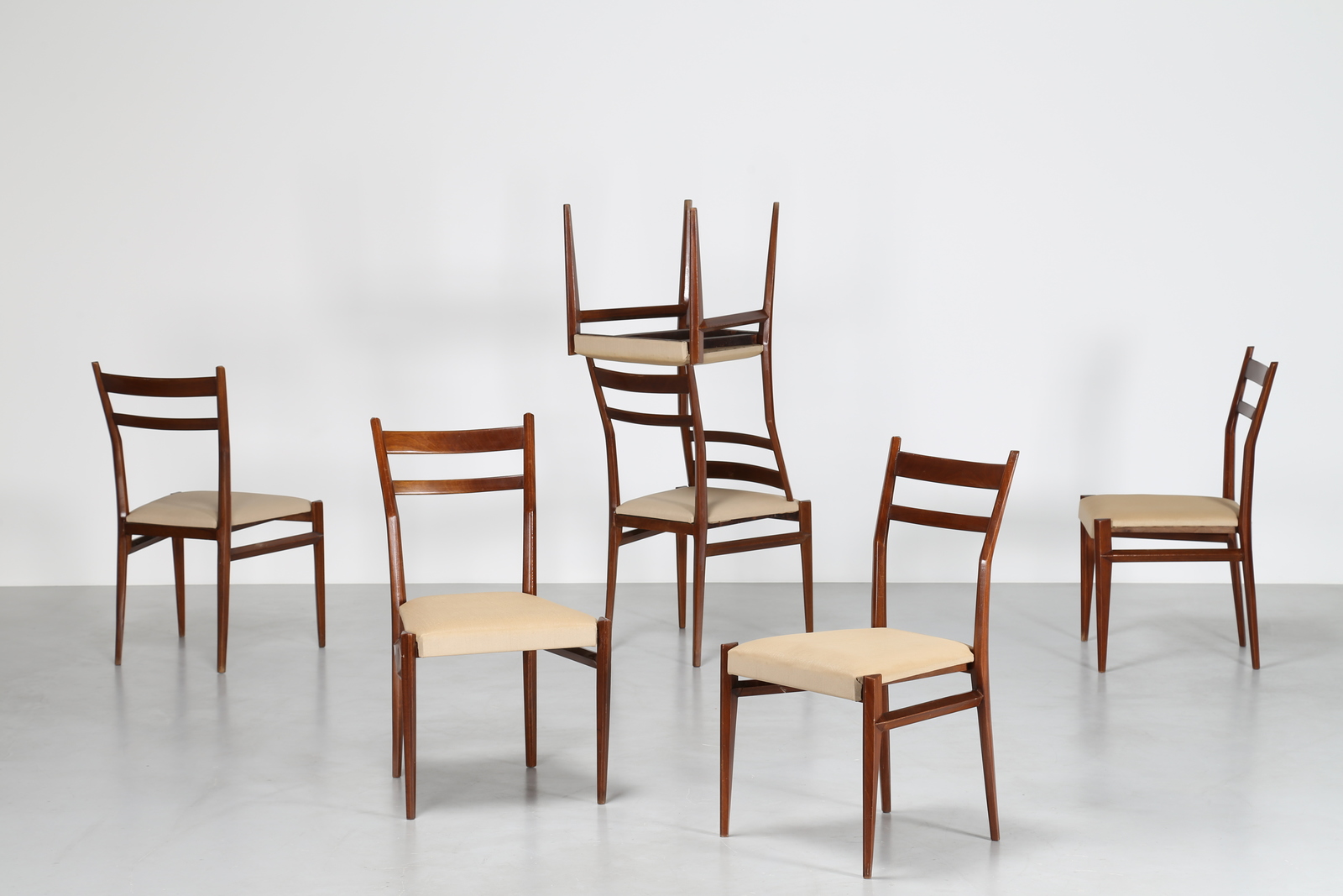 MOSCATELLI GIULIO Sei sedie Legno di noce e tessuto, per Consorzio...