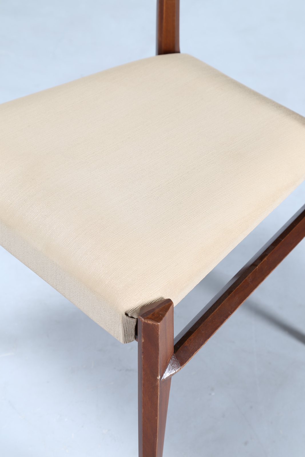 MOSCATELLI GIULIO Sei sedie Legno di noce e tessuto, per Consorzio Esposizione Mobili Cantù, anni 50. Pubblicazione; Consorzio internazionale del mobile, a cura di Catalogo delle mostre selettive di Cantù 1955-1961, p. 45 . -. Cm 52,00 x 91,00 x 46,00.