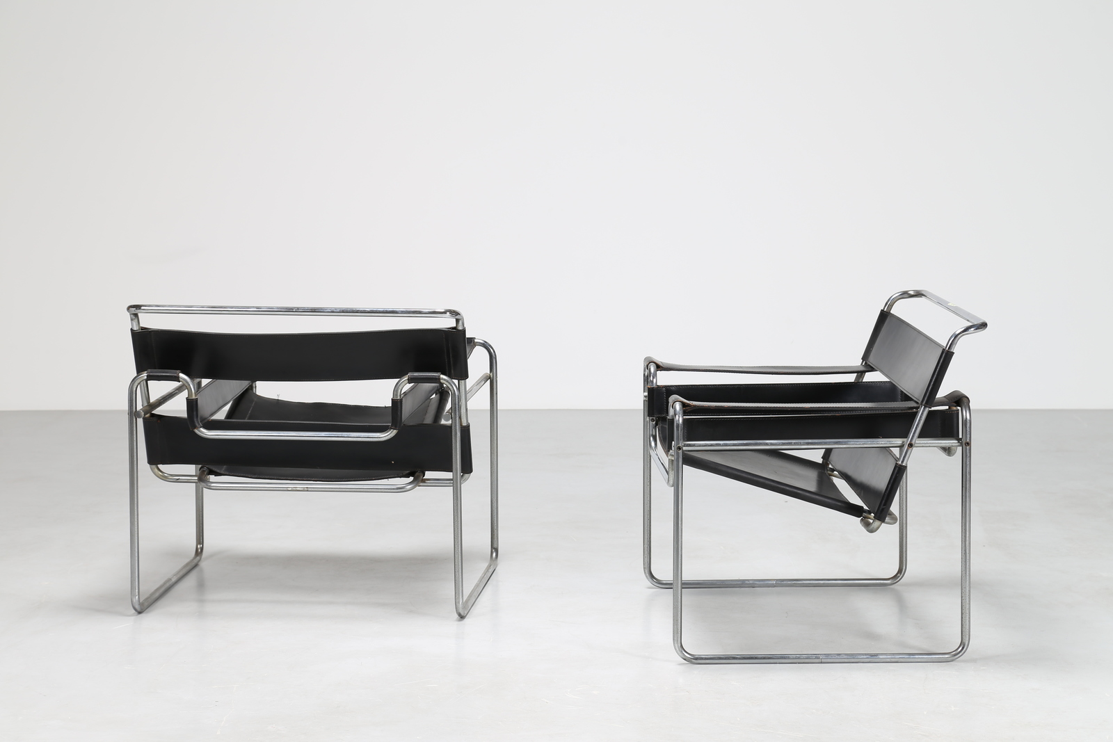 BREUER MARCEL LAJOS (1902 - 1981) Coppia di poltrone in metallo cromato e cuoio nero mod. Wassily, per Gavina Anni 60 . -. Cm 78,00 x 74,00 x 68,00.
