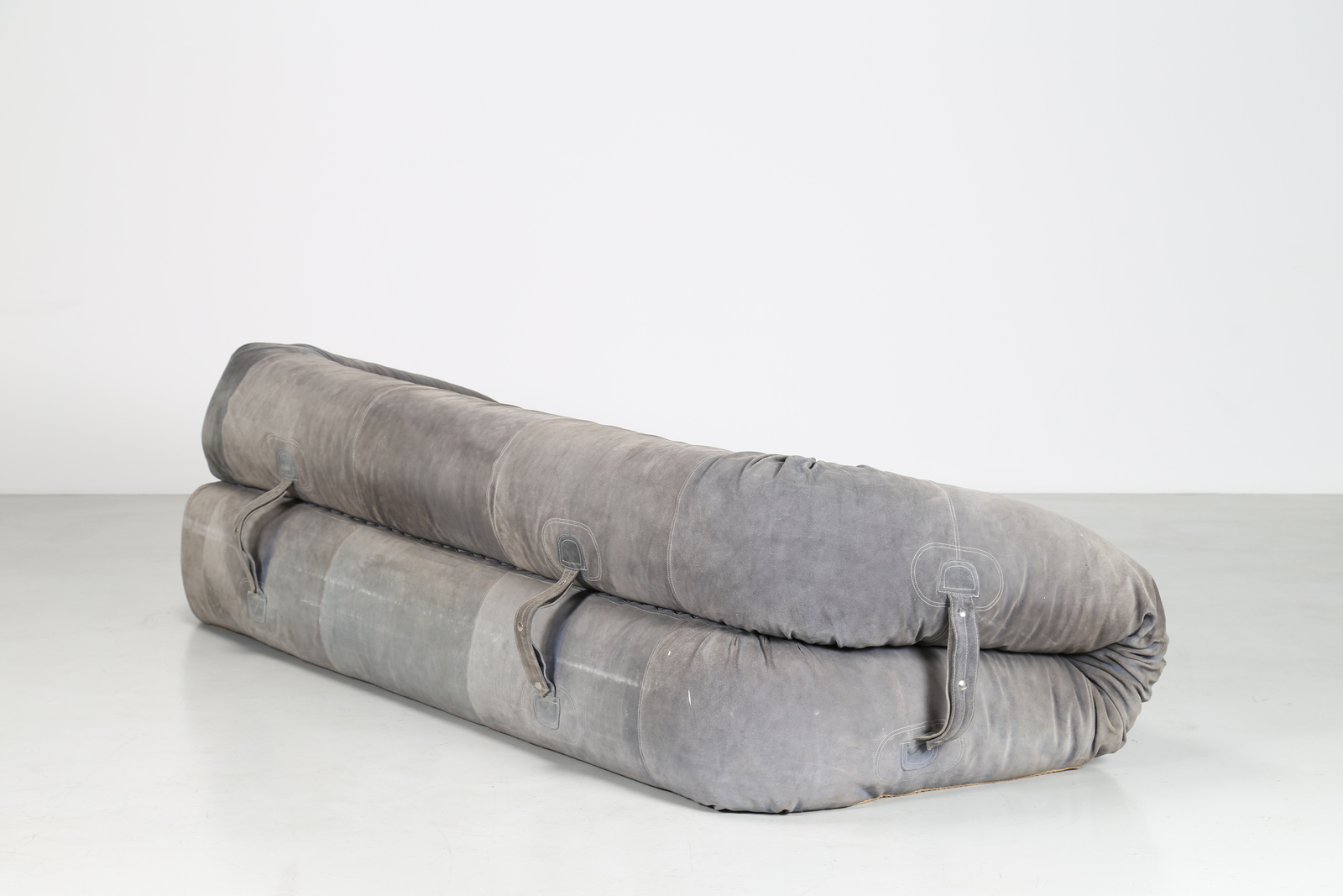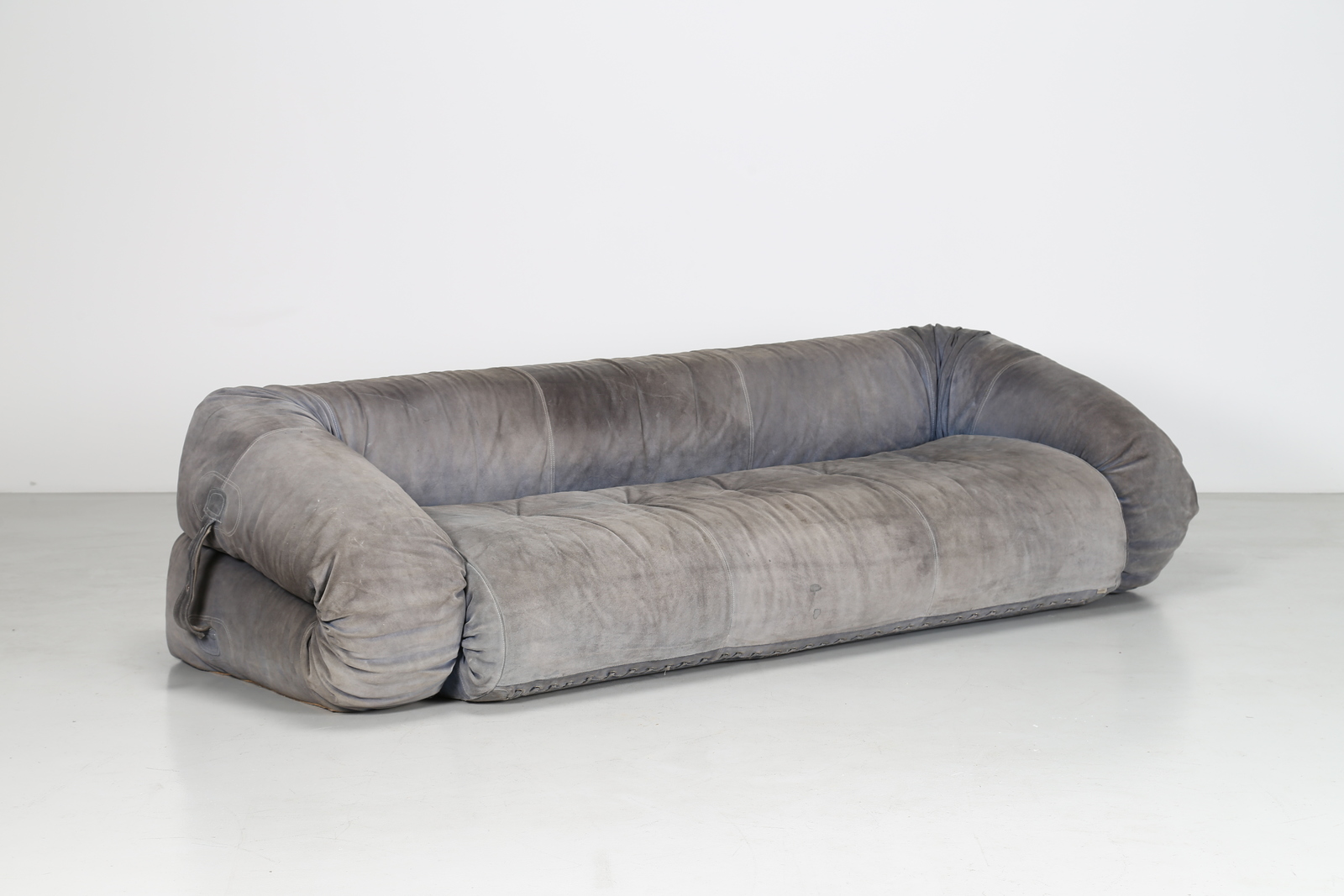 BECCHI ALESSANDRO (n. 1946) Divano in camoscio mod. Anfibio, per Giovanetti, anni 70. Pubblicazioni; Domus n. 502 settembre 1971 pag. 108, Domus n. 518 settembre 1972 pag. 77, Domus settembre 1972, Domus gennaio 1973. . . Cm 250,00 x 62,00 x 105,00.