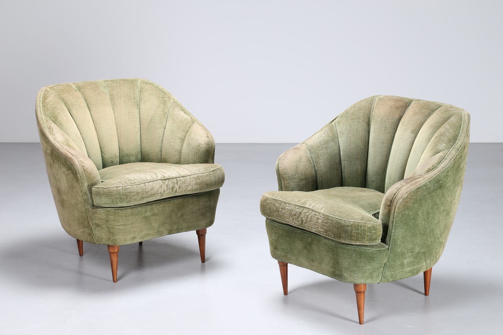 FRATELLI BORGHI Attrib. Coppia di poltrone in velluto verde e piedini in legno, anni 40 . . Cm 87,00 x 88,00 x 90,00.