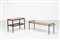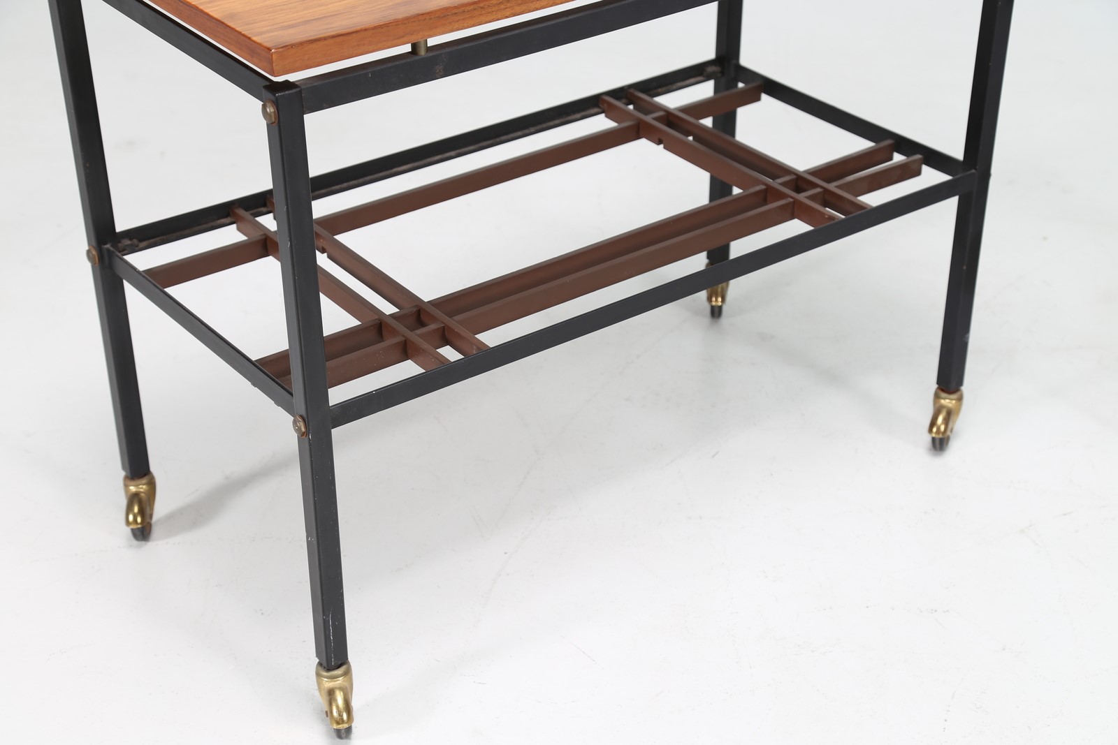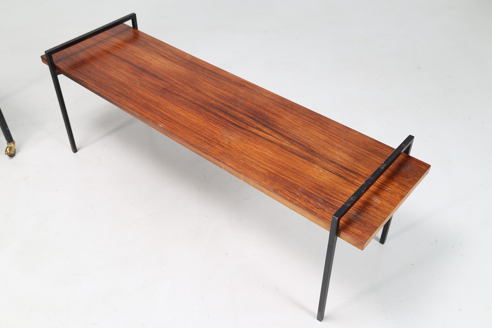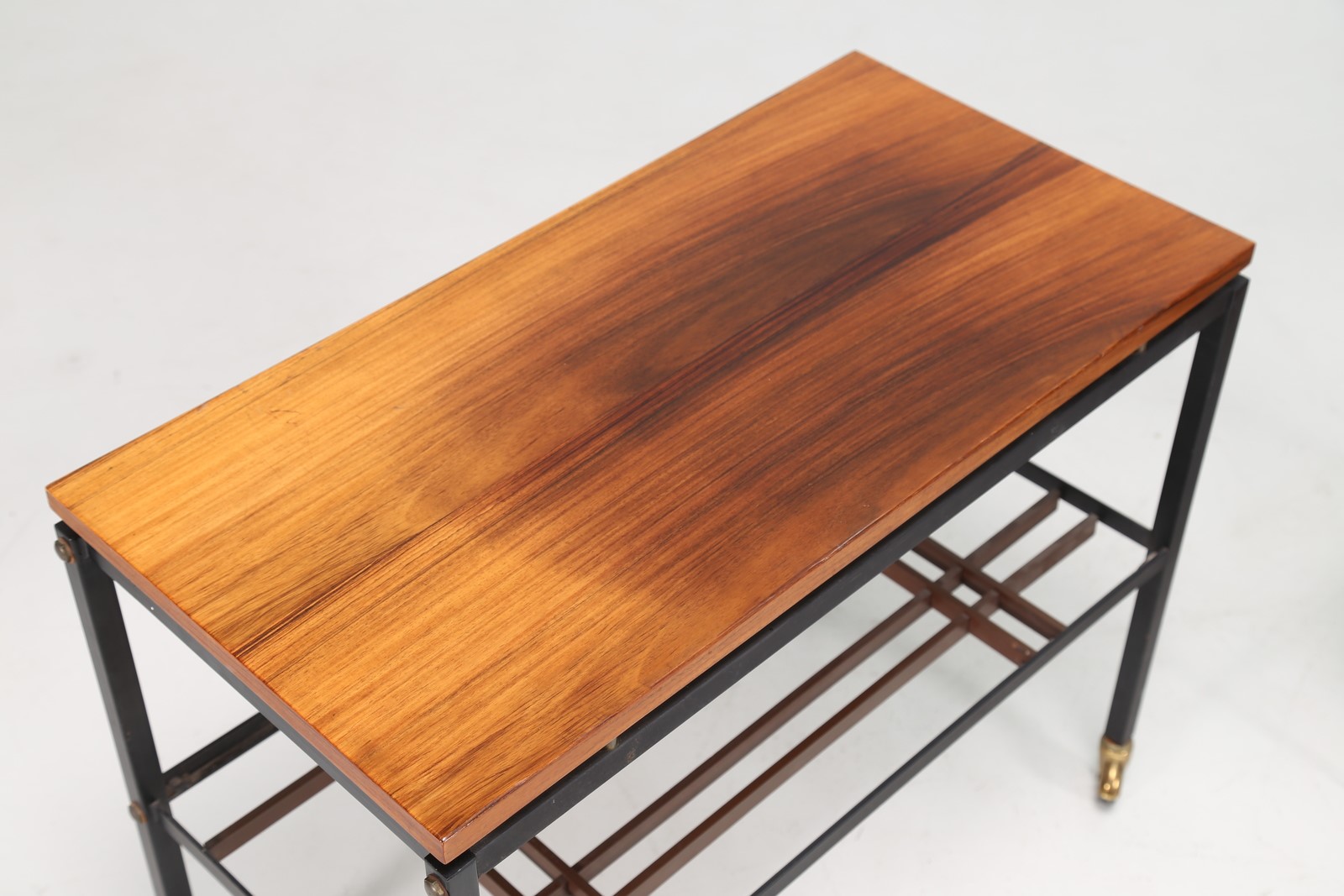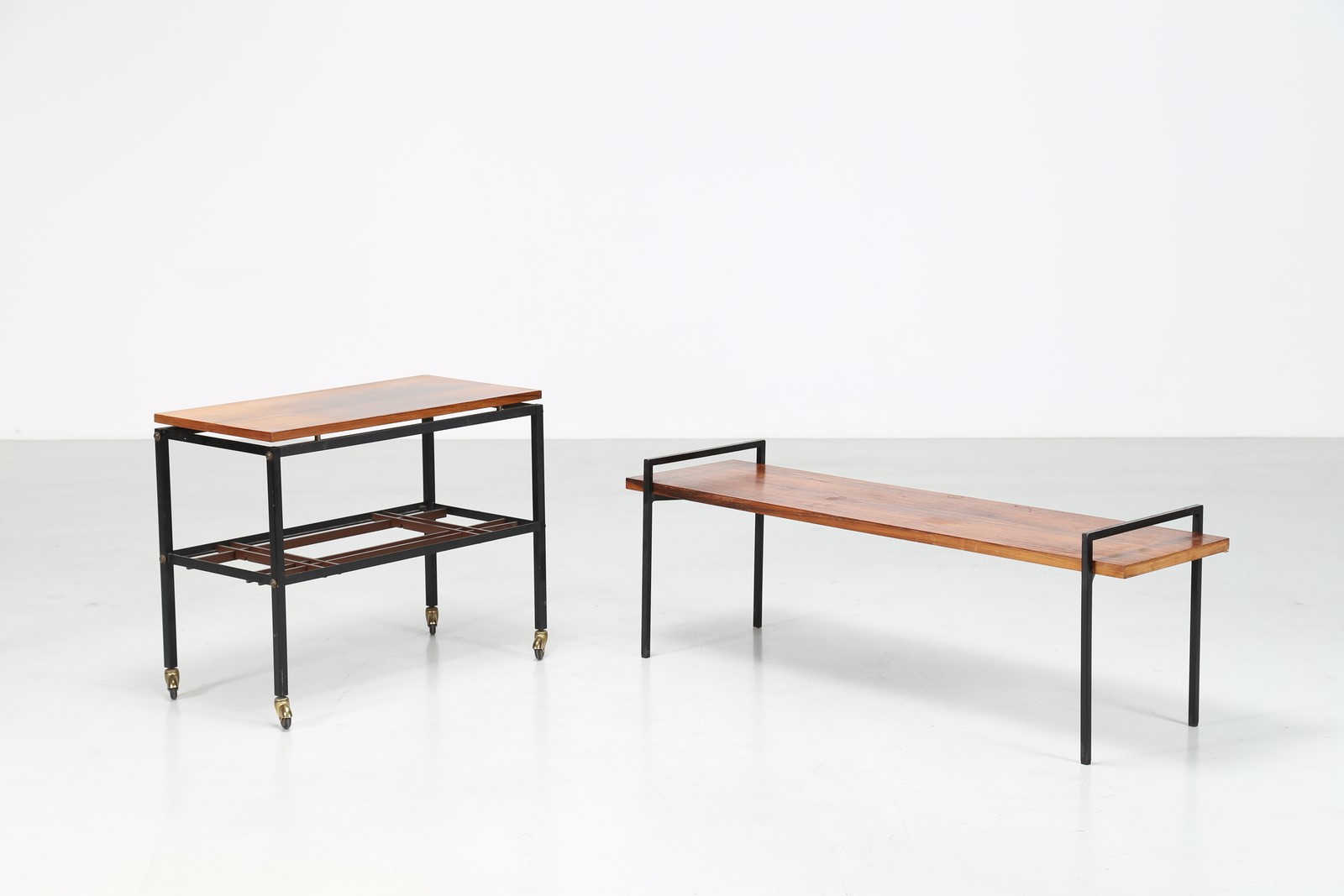 MANIFATTURA ITALIANA Tavolino e carrello in palissandro e metallo laccato, anni 60. -. Cm 39,00 x 44,50 x 130,00. Dimensioni carrello: 60x37x64 cm.
