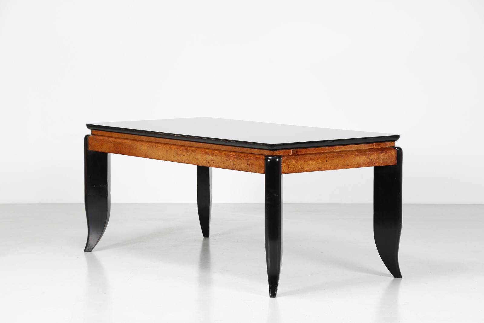 MANIFATTURA ITALIANA Tavolo in legno laccato, radica e opaline, anni 70. -. Cm 186,00 x 83,00 x 96,00.