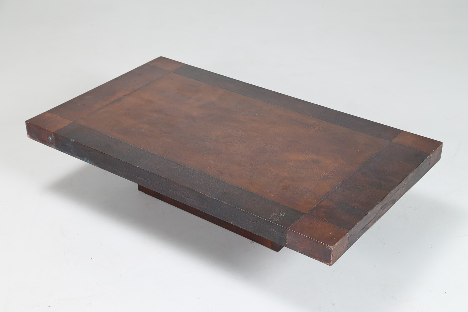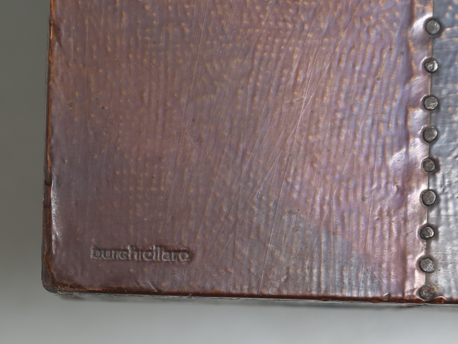 BURCHIELLARO LORENZO (n. 1933) Tavolo da caffe in legno con piano rivettato in rame, produzione Burchiellaro, anni 70. Firma presente su bordo. . -. Cm 130,00 x 30,00 x 75,00.