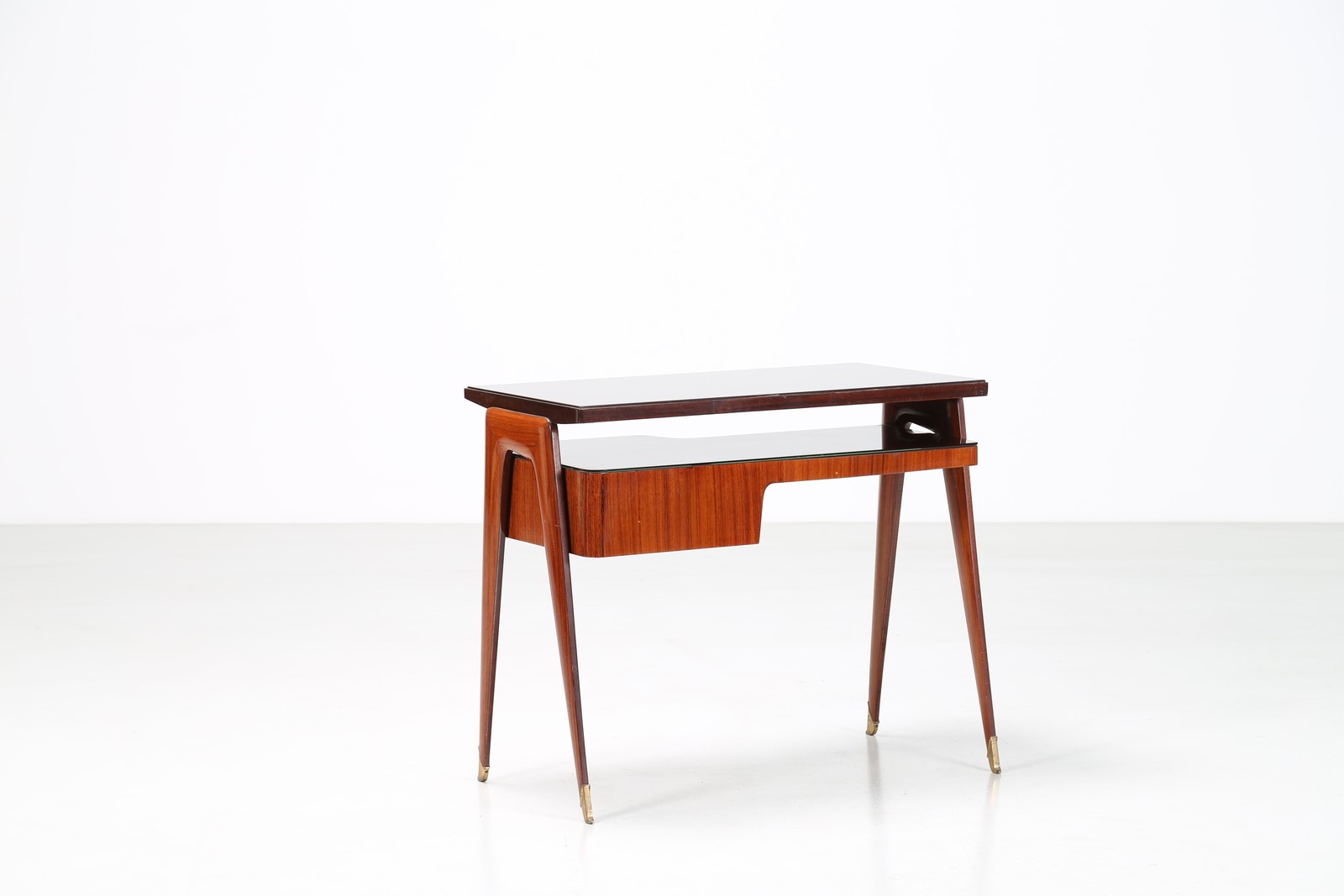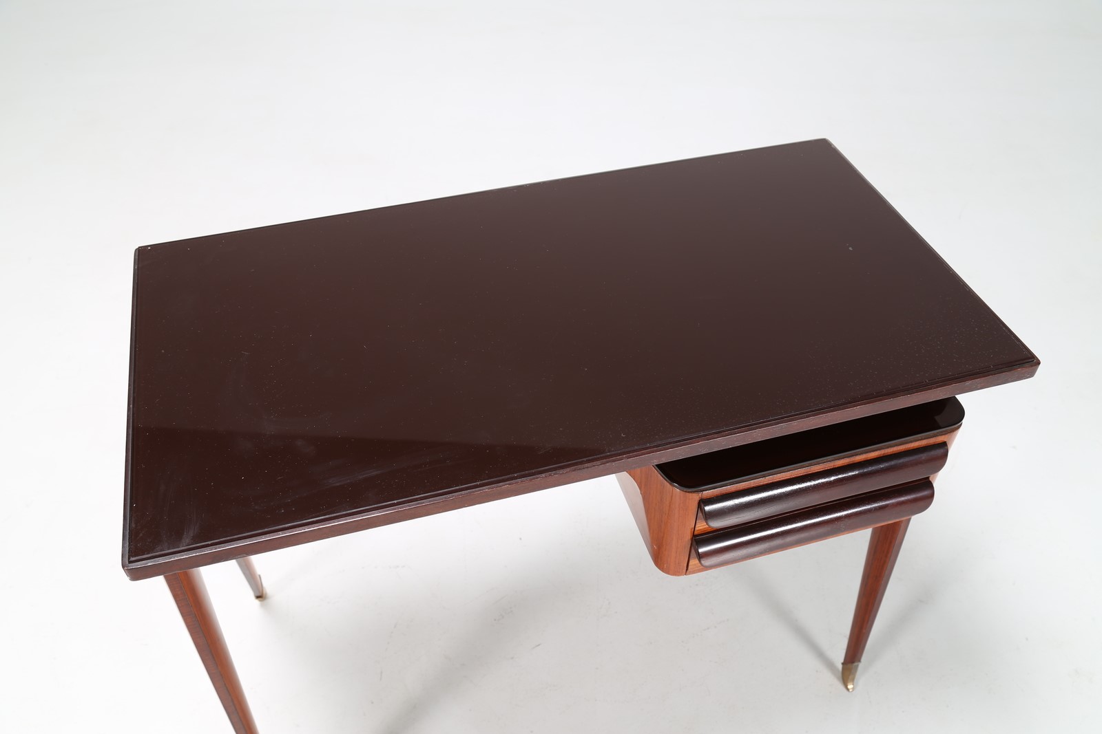DASSI VITTORIO Scrittoio in mogano con piano in cristallo, per Dassi Mobili Moderni, anni 50. . Cm 86,50 x 73,50 x 45,00.