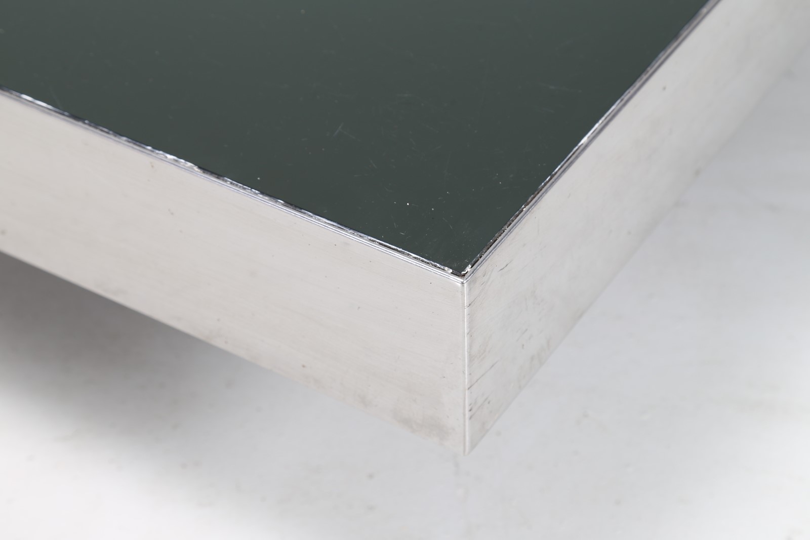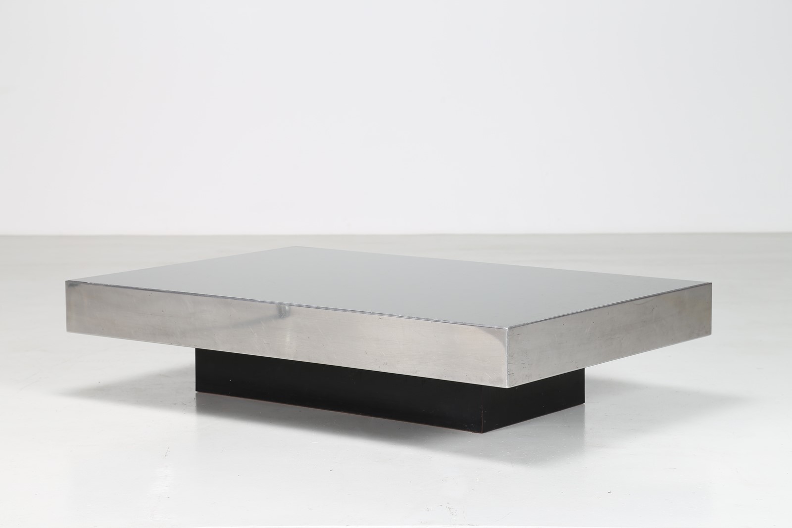 GIOVANNI AUSENDA & GUIDO BALDO GROSSI & GIANNI GAVIOLI Tavolino da salotto in legno, acciaio e vetro, mod. Shillings, per NY FORM anni 70°. -. Cm 120,00 x 27,00 x 80,00.