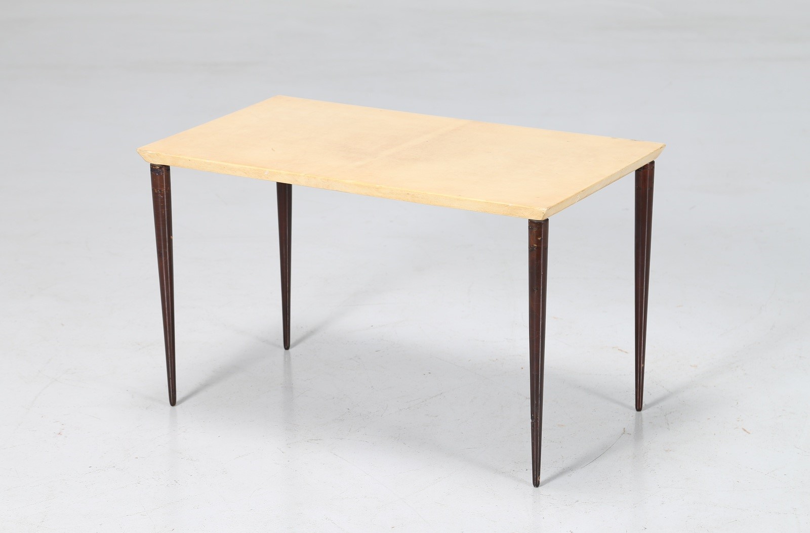TURA ALDO Tavolino da caffè in legno laccato e pergamena, anni 50. Etichetta presente. -. Cm 67,00 x 41,00 x 39,00.