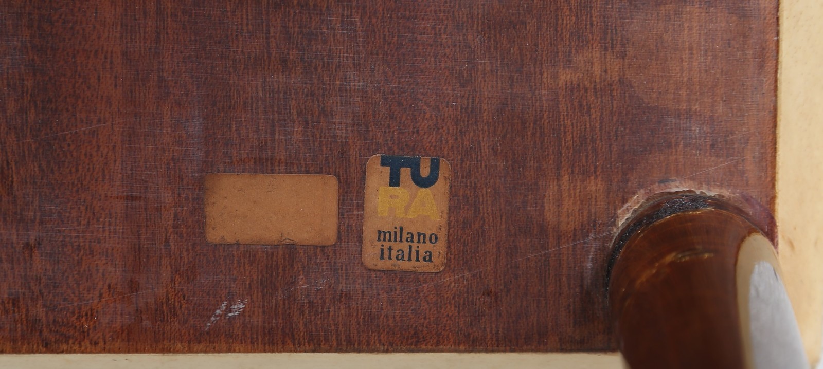 TURA ALDO Tavolino da caffè in legno laccato e pergamena, anni 50. Etichetta...