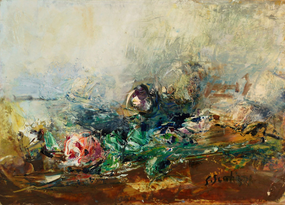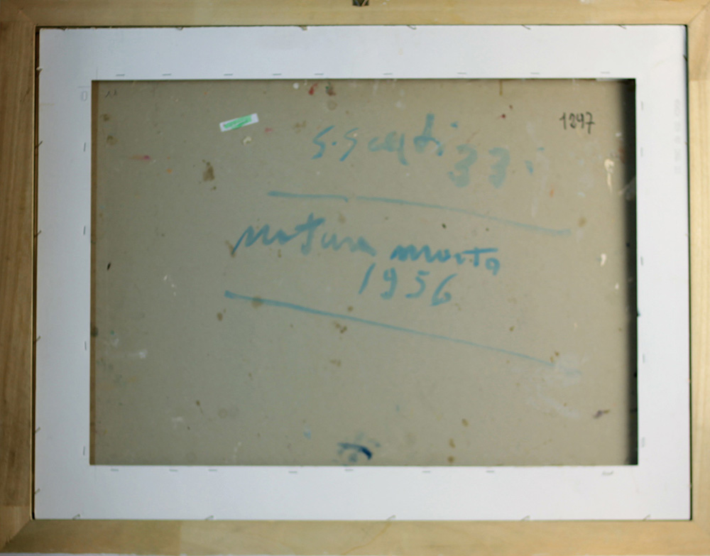 Sergio Scatizzi (Capannori 1918 – Firenze 2009) Natura morta 1956 Olio su cartone dim. 50X70 Firmato in basso a dx Autentica su foto dell'Artista Archiviato in data 25/07/2003 presso Studio d'Arte Moderna “Il Fiore”