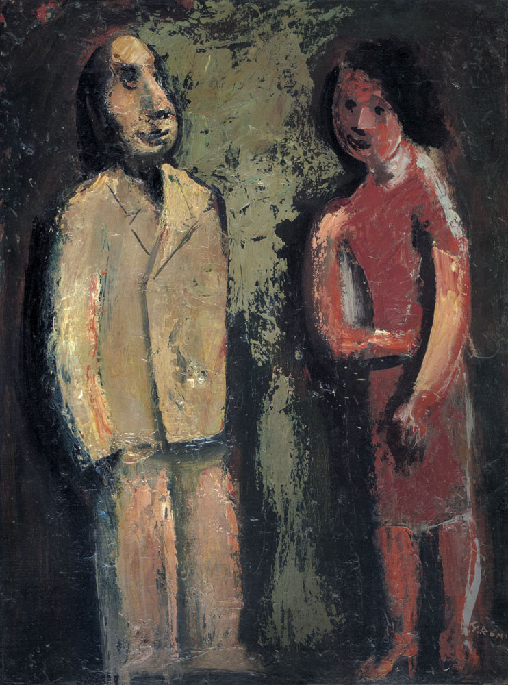 MARIO SIRONI Sassari 12/05/1885 - Milano 05/08/1961 - Figure, (1943/1944), olio su tela cm. 70x52, firma in basso a destra, titolo, firma, etichette della Galleria d'Arte Cairola (MI), della Galleria d'Arte Del Naviglio (MI) e della Galleria d'Arte Narciso al retro, dichiarazione d'autenticità a cura di Francesco Meloni e timbro della Galleria Poleschi Arte (LU) su foto.