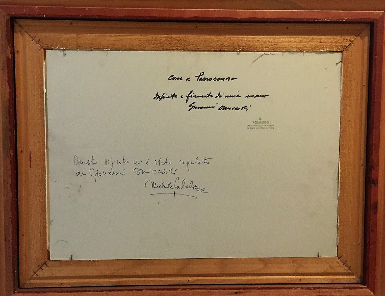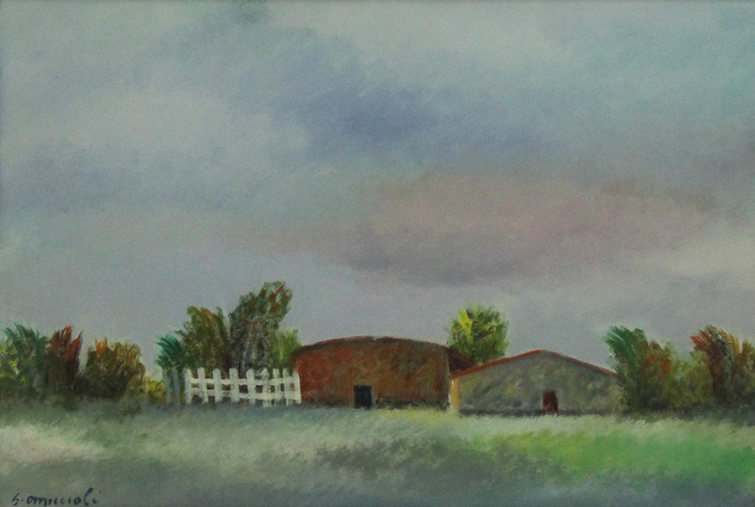 Giovanni Omiccioli (Roma 1901 – Roma 1975) Case a Passoscuro Olio su cartone dim. 37X51 Firmato in basso a sx Al verso Dichiarazione di autenticità dell'Artista Timbro Il Poliedro