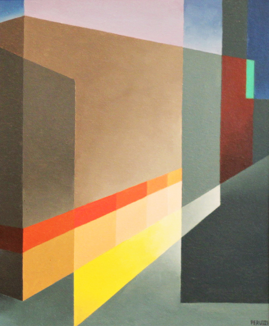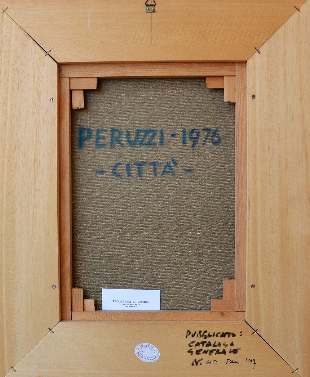 Osvaldo Peruzzi (Milano 1907 – Livorno 2004) Città 1976 Olio su tela dim. 40X30 Firmato in basso a dx Al verso Firma, titolo e data Opera pubblicata sul catalogo Generale delle Opere di Osvaldo Peruzzi a Pag. 107 Edizioni Electa