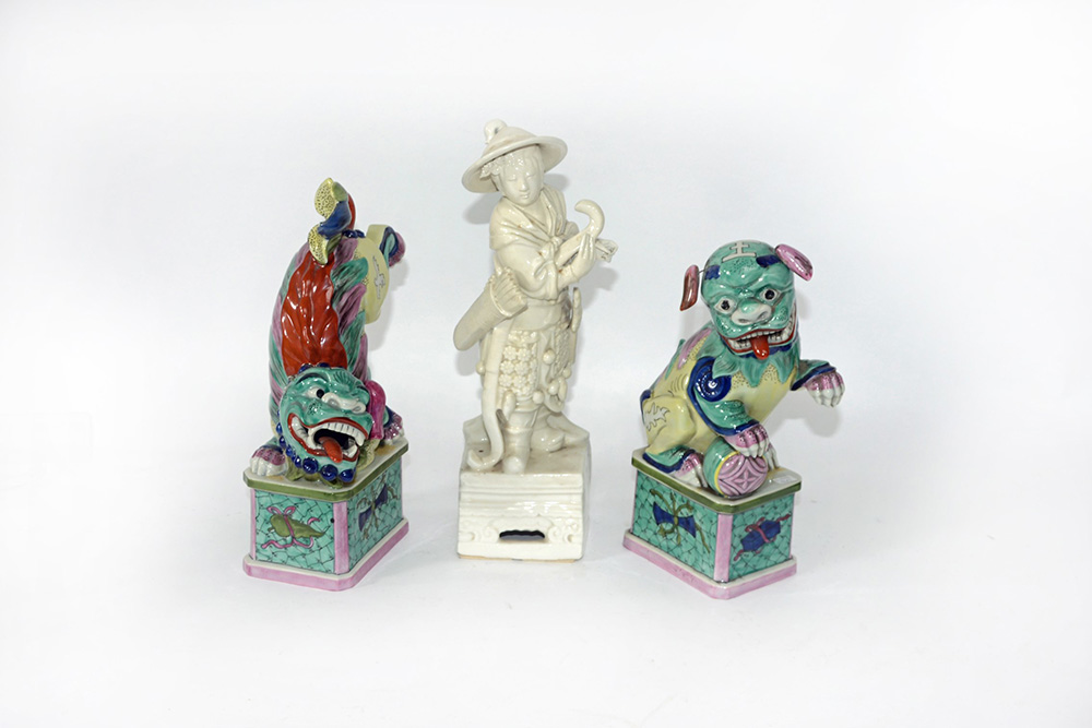 Lotto composto da una coppia di cani di Pho in porcellana policroma unito a una figura di contadina in porcellana Blanc-de-Chine (difetti e mancanze) Cina, sec. XX (h max cm 32)