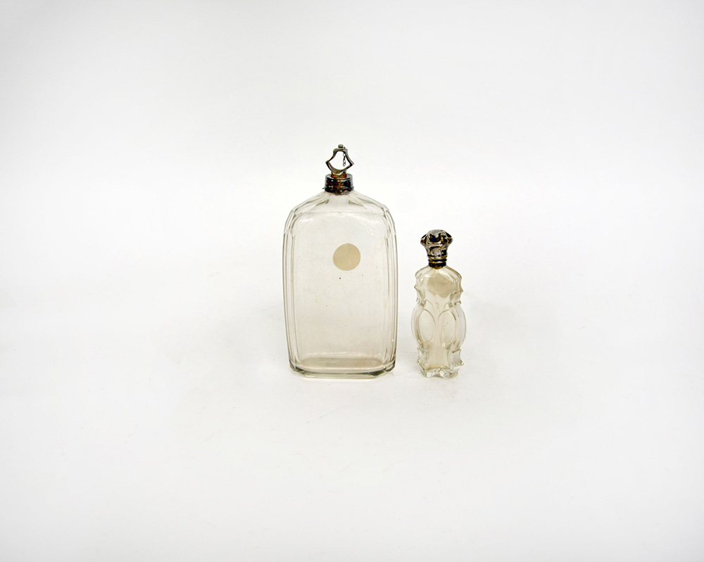 Due antiche bottigliette in vetro di forme diverse, con tappi in argento (difetti e mancanze)