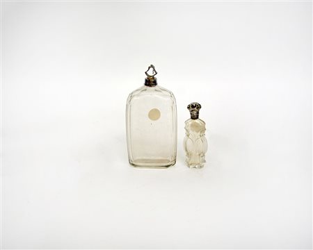 Due antiche bottigliette in vetro di forme diverse, con tappi in argento...