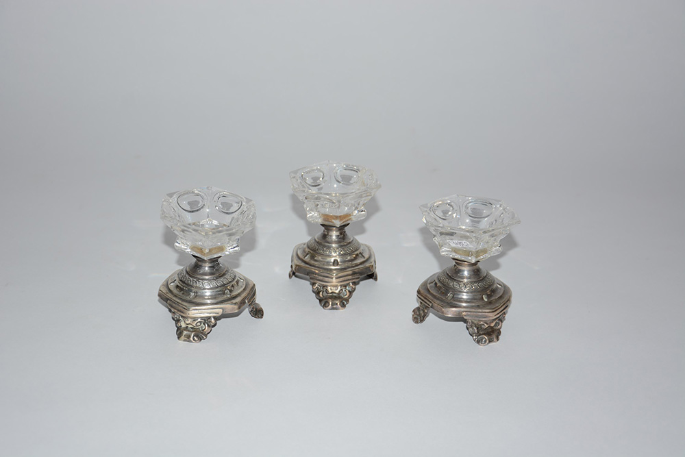 Tre saliere in vetro e argento con corpo a rocchetto esagonale, decorato da fascia godronata, e piedini sbalzati a volute. Regno di Sardegna, Genova, XIX secolo (h cm 8,5 ca) (difetti e rotture)