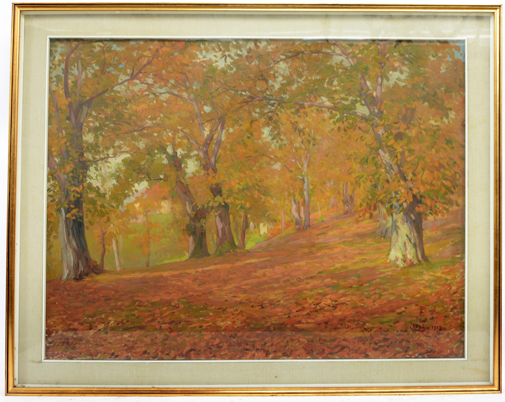 Antonio Zoppi (1860 - 1926) "Castagneto in autunno" olio su tela (cm 75x95) firmato e datato 1918 in basso a destra. Etichetta con titolo dell'opera al verso, in cornice (lievi difetti)