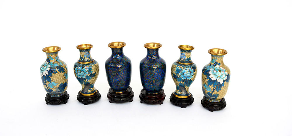 Arte di Cina, gruppo di sei vasetti in metallo cloisonne (h cm 13) basi in legno