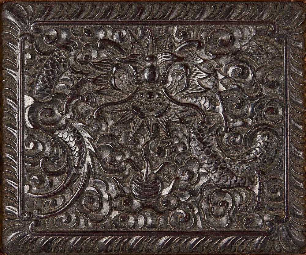 Pannello rettangolare in legno intagliato con figura di drago tra nuvole, con cornice (difetti) Cina, sec. XX (15,5x19 cm.) -EN A hardwood rectangular panel carved with a dragon amongst clouds, framed (flaws) China, 20th century (15,5x19 cm.)