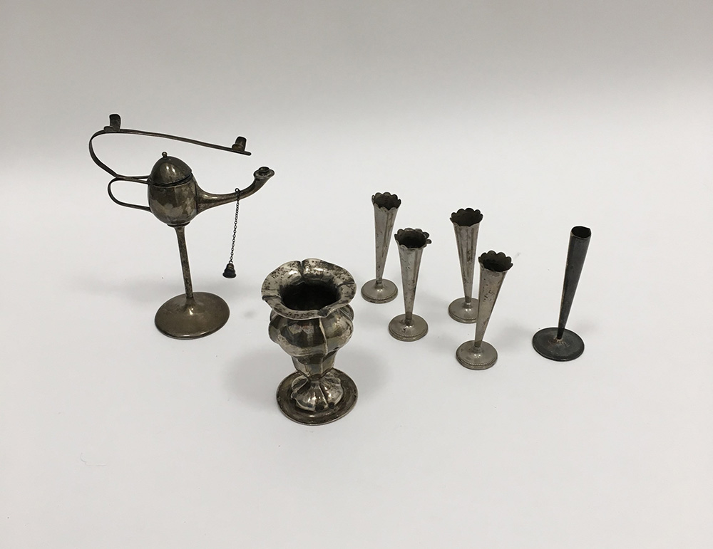 Lotto in argento composto da un lume e sei vasetti (gr lordi 270 ca.) (difetti)