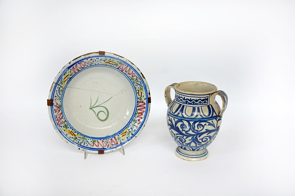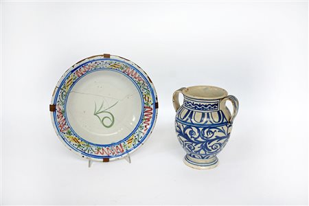 Manifattura del sec. XIX, lotto composto da una ciotola e un vaso biansato in terraglia policroma (difetti e restauri)