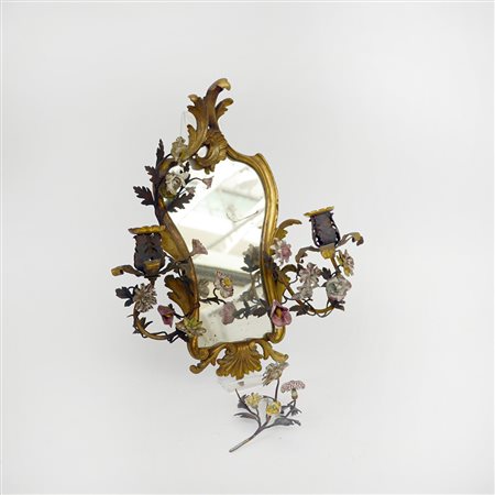 Specchierina di forma sagomata in bronzo cesellato decorata a fiorellini in porcellana policroma (difetti)