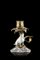 Piccolo candeliere ad una candela in porcellana e metallo dorato. La base è decorata alla "famiglia verde" e il sostegno è costituito da una statuina di cane carlino con collare. Sec. XIX (h. cm 10) (difetti e restauri)