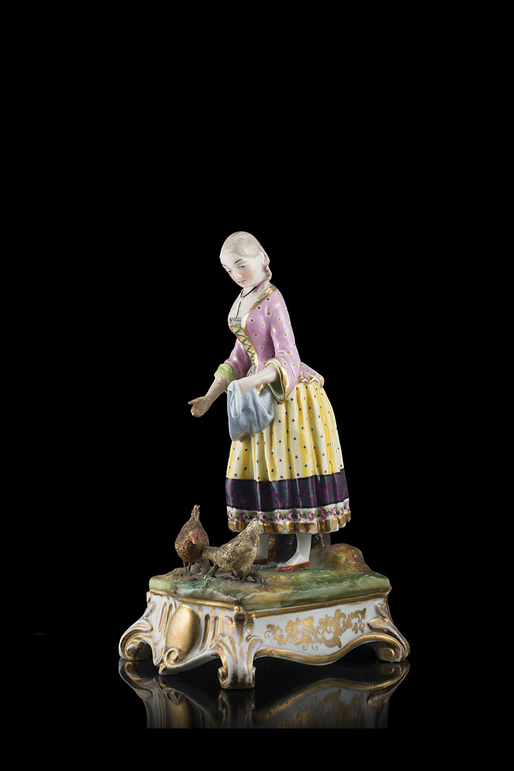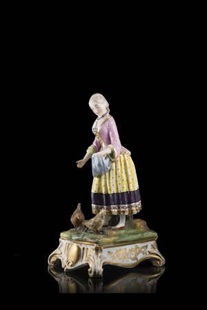 "Contadina con galline" piccola plastica in porcellana policroma su base con profili dorati. Sul retro, il tronco vuoto è probabilmente un portafiori. Francia, sec. XIX (h. cm 25) (restauri e usure)
