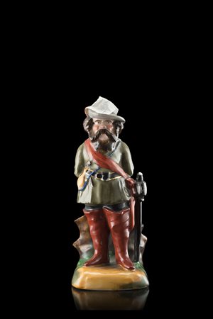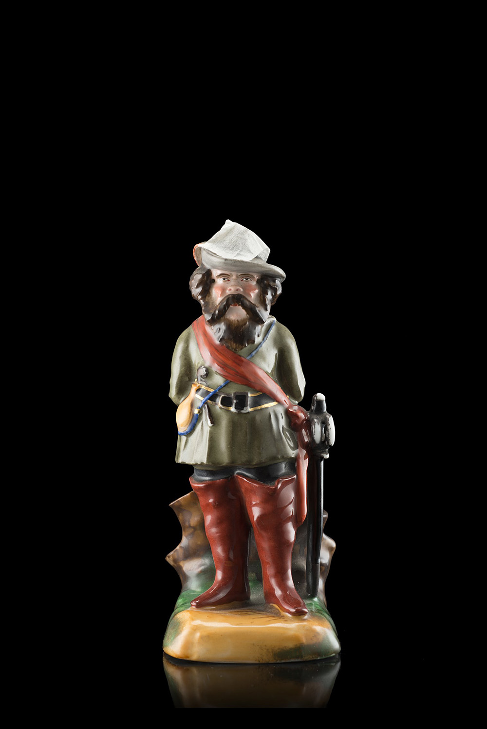 "Cacciatore" piccola plastica policroma in porcellana su base rettangolare a simulare una zolla erbosa. La statuina è una bottiglia vuota all’interno per contenere profumi e nel cappello è celato un tappo. Sul retro, i tronchi d’albero sono contenitori cavi, forse portapenne o portafiori. Sotto alla base, compaiono le lettere CF incise. Francia, sec. XIX (h. cm 16) (lievi difetti)