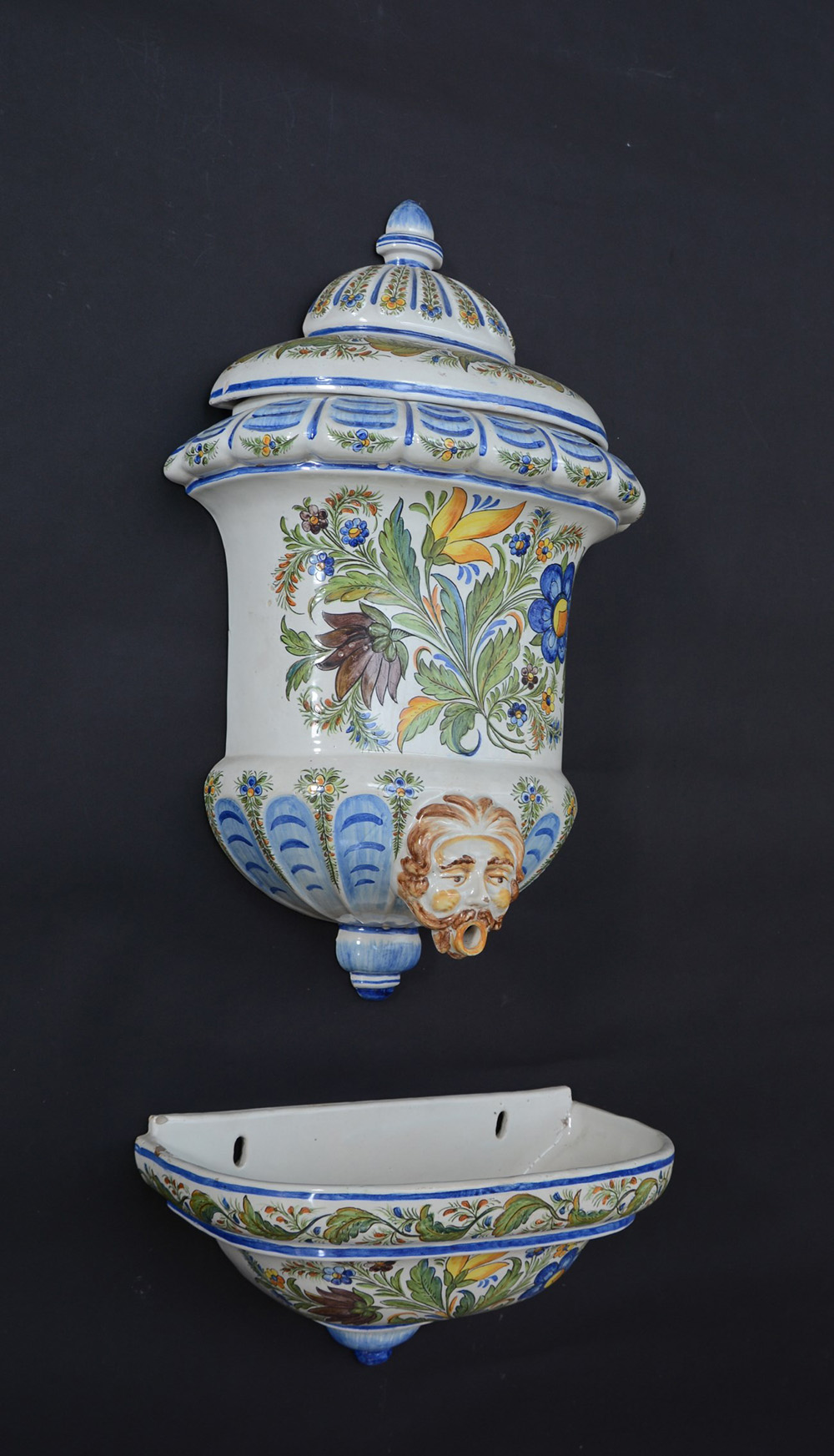 Acquamanile in terraglia smaltata decorata a mascherone e motivi vegetali policromi (difetti)