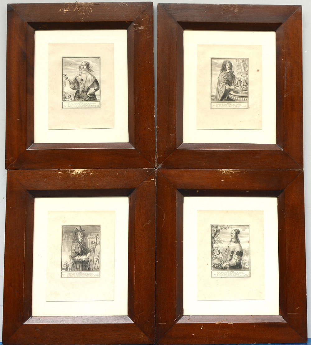 Gruppo di quattro antiche incisioni su rame da Abraham Bosse raffuguranti i quattro elementi naturali (cm 24x20 il folio) in cornici (difetti)