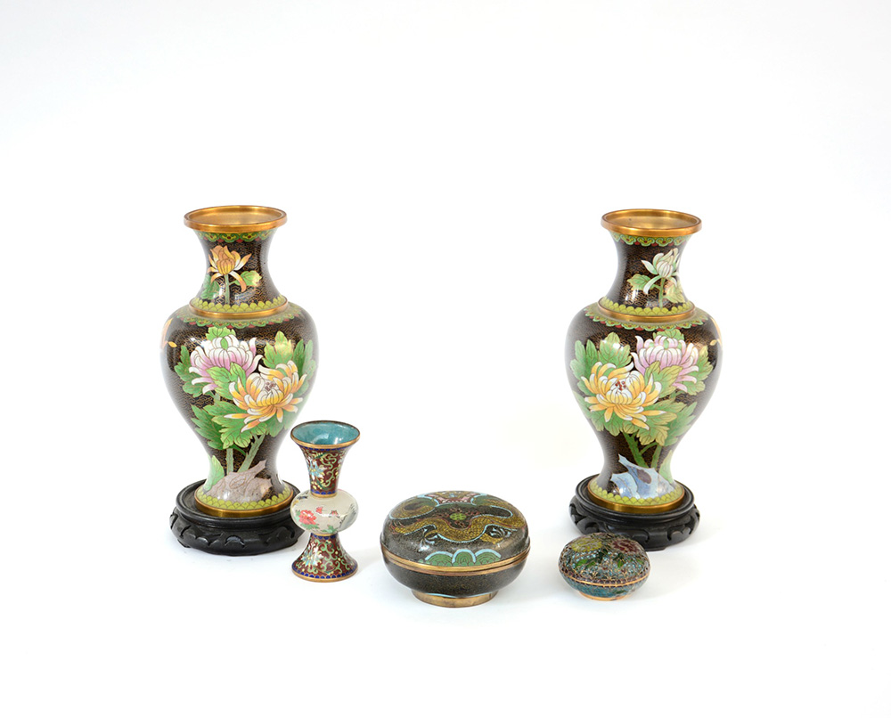 Lotto composto da due vasi, due scatole con coperchio e un bicchiere in metallo cloisonné di diversa forma e decoro (difetti) Manifattura orientale