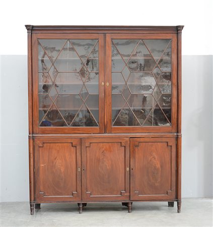 Libreria a due corpi lastricata in noce, parte superiore a due ante a vetri decorate a listelli, parte inferiore a tre ante riquadrate, piedi torniti, sec. XIX ( cm 194x233x38)(difetti)