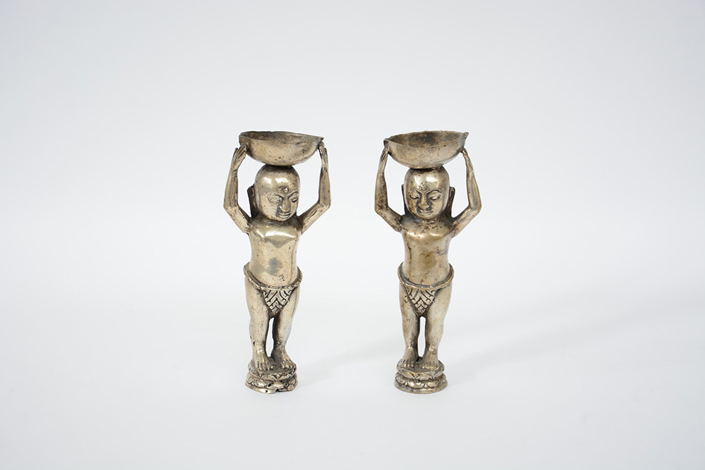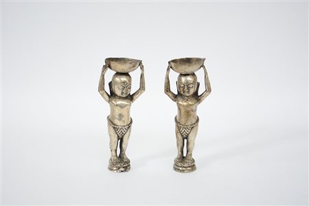 Coppia di figure orientali porta incenso in metallo argentato (difetti)(h. 21 cm.)