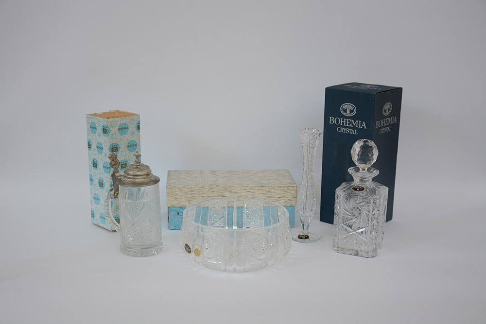 Lotto composto da quattro oggetti in cristallo di diverso uso, in custodia (difetti)