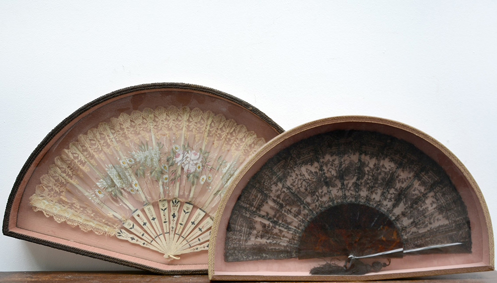 [Tappeti] Lotto composto da due ventagli, uno in pizzo nero ad ago con...