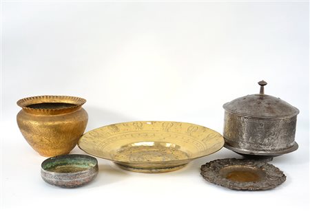 Lotto composto da tre contenitori e due piatti in metallo ed ottone (difetti)