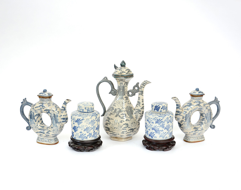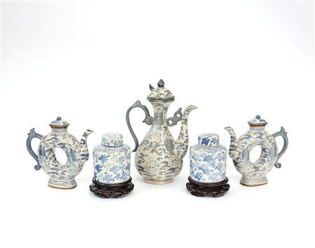Lotto composto da tre versatoi e due scatole in ceramica di manifattura orientale decorati in bianco e blu (difetti)