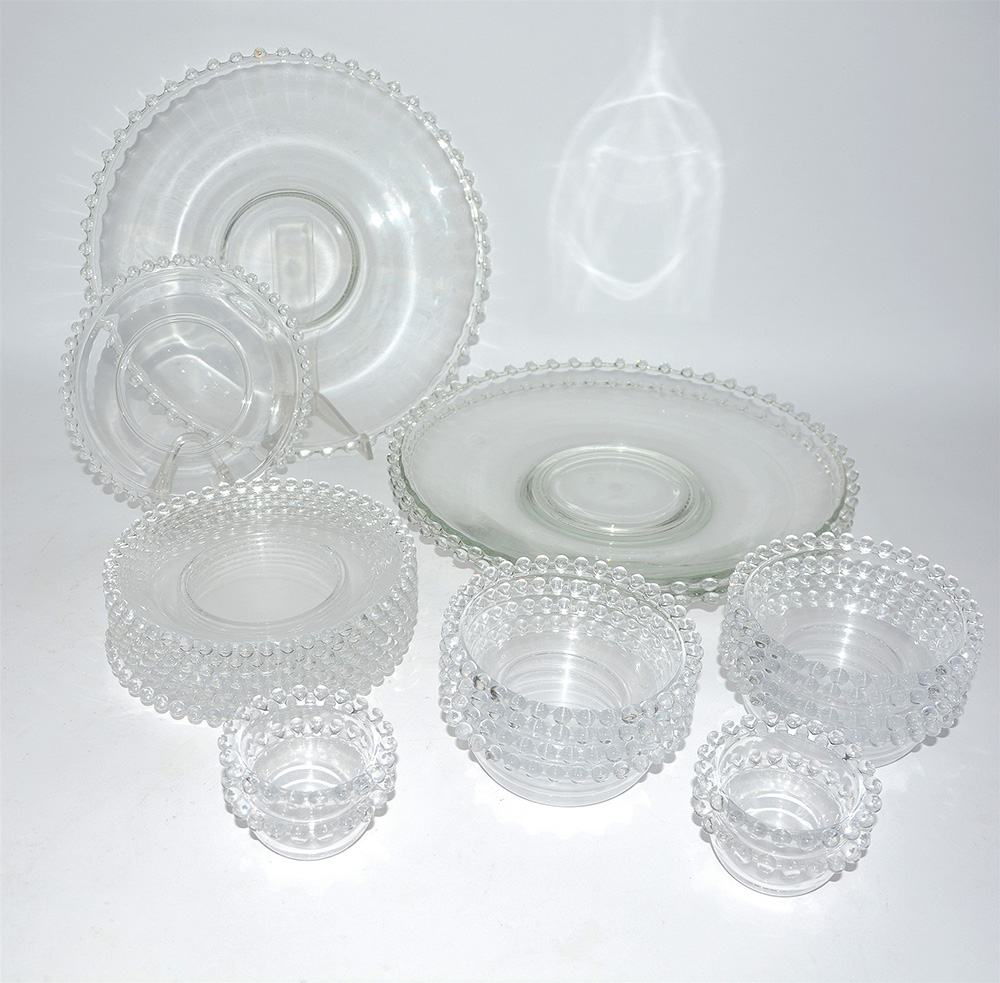 Servizio da tavola in vetro con perlinatura composto da numerosi pezzi...