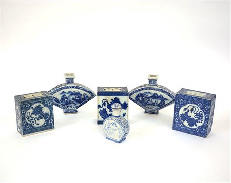 Lotto composto da cinque vasi in diverse forme e una bottiglia con tappo, in ceramica decorati nei toni del blu (difetti)